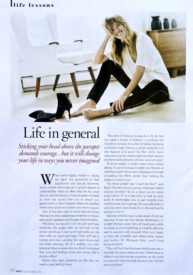 In the November 2014 issue of Next Magazine, Rebecca Barry-Hill talks VISIBILITY and asks me for some of my tips on visibility for LIFE IN GENERAL.